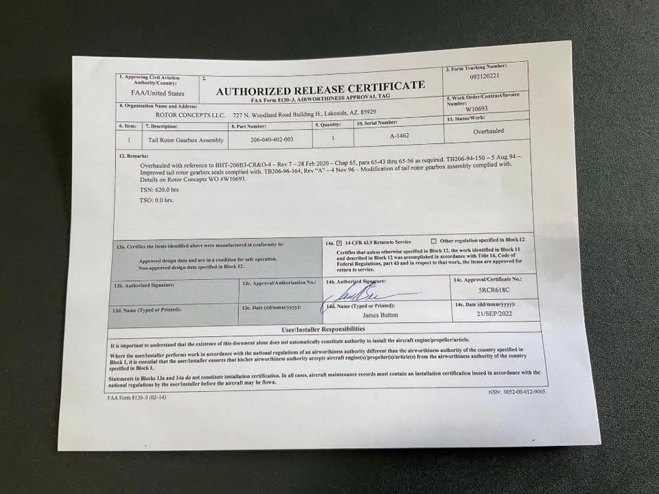 Accompanying the gearbox is a valid FAA Form 8130, confirming airworthiness approval and compliance verification. For commercial, private, and fleet aircraft operations, proper documentation is essential for installation approval, audit readiness, and safety management systems. FAA documentation requirements and airworthiness traceability align directly with guidance and regulatory material maintained on FAA Aircraft Certification Services, reinforcing the value of properly certified components such as this one. Bell 206 Tail Gearbox | Affordable Aircraft Parts